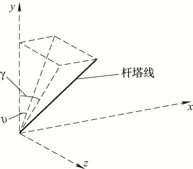 如图2所示是输电线路的笛卡儿坐标系简化图,假设左侧杆塔倾斜,则可以确定y轴与塔筒在x-y平面上的投影之间的角度υ、y轴与塔筒在z-y平面上的投影之间的角度γ,通过υ和γ即可确定塔的倾斜程度。