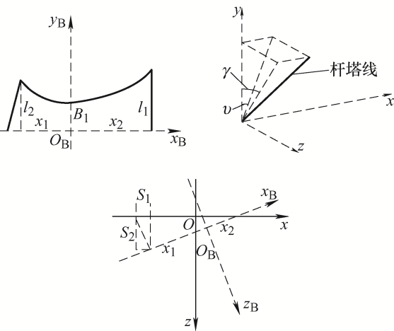 由于相对于最低点的线的形状不受塔倾角的影响,因此抛物线形状仍可以用来表示xB-yB-zB坐标系中的传输线B,为