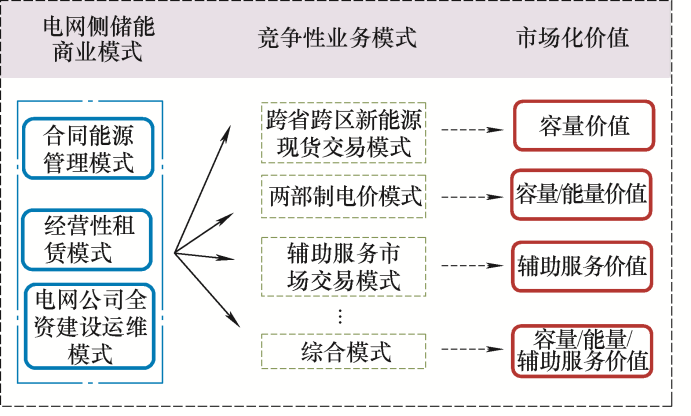 由图1可知,当前电网侧储能商业模式主要有三种。一是经营性租赁模式。在该模式中,电网公司租赁第三方供应商的储能设施,租赁费用由储能设施供应商和电网公司协商确定。二是合同能源管理模式。在该模式下,电网公司对用户、第三方供应商等主体所有的储能设施进行运维管理,取得的收益按双方合同约定的比例进行分享。三是电网公司全资建设运维模式。由于《输配电定价成本监审办法》中提出,抽水蓄能和电储能成本不得计入输配电成本范围,限制了电网公司投资电网侧储能的积极性[26]。储能参与电力市场市场化价值体现在容量价值、能量价值和辅助服务价值三个方面。因此,将储能视为竞争性业务,按照投资回收方式不同,该竞争性业务模式又可细分为两部制电价模式、辅助服务市场交易模式、跨省跨区新能源现货交易模式和综合模式等[27]。
