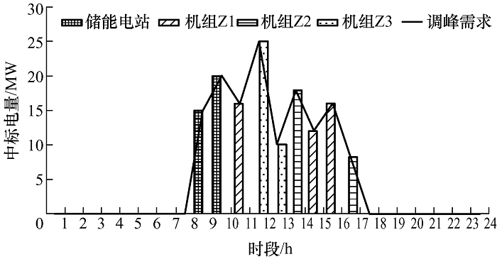 储能参与调峰辅助服务市场在日前发电计划编制完成后开展,其中储能电站分段申报调峰容量与补偿价格,故其中标调峰容量为各个储能电站各时段中标量的累加