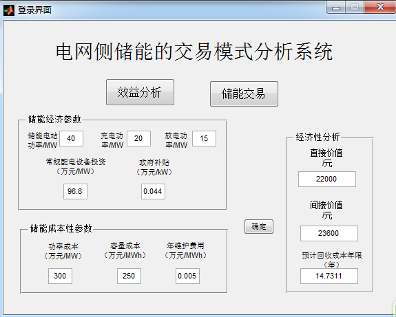 利用Matlab GUI对上述的相关分析进行设计封装,主要分为两个主要界面:效益分析界面和储能交易界面。通过控件在设计界面按照设计需求进行布局,利用各控件的属性,结合Matlab相关程序实现界面之间的跳转并完成算法分析。