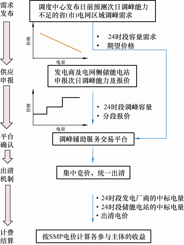 调度公司日前计划定制后,若有省(市)电网区域出现日前预测调峰资源不足,则将调峰资源不足的省(市)电网区域作为买方申报次日24时段的调峰容量需求及其相应的期望价格,即提交包含量价信息的投标,并按照价格从高到低的顺序进行排列,可以得到市场上的需求曲线,由于电力需求弹性极低,此时直接以负荷预测值作为市场的电能需求,即需求曲线被假定为一根竖直线,它的横坐标就等于负荷预测值;卖方发电公司根据储能电站及发电机组的情况申报次日24时段的分段调峰容量与分段(三段)补偿价格,其中发电报价按从低到高的顺序进行排列,由此可以得到一条表示价格与累计数量关系的函数曲线,该曲线就是市场上的供应曲线。调峰辅助服务交易平台考虑相关约束后,采用SMP价格分24时段进行出清。所有申报价格低于或等于市场出清价的报价都会被接受,卖方发电公司需要按照他们的中标报价所对应的电能数量组织电力生产,同时所有价格高于或等于市场出清价的投标都会被接受,买方客户可以依据他们的中标投标所对应的数量从系统中获取电能。电网侧储能参与调峰辅助服务市场交易流程如图4所示。