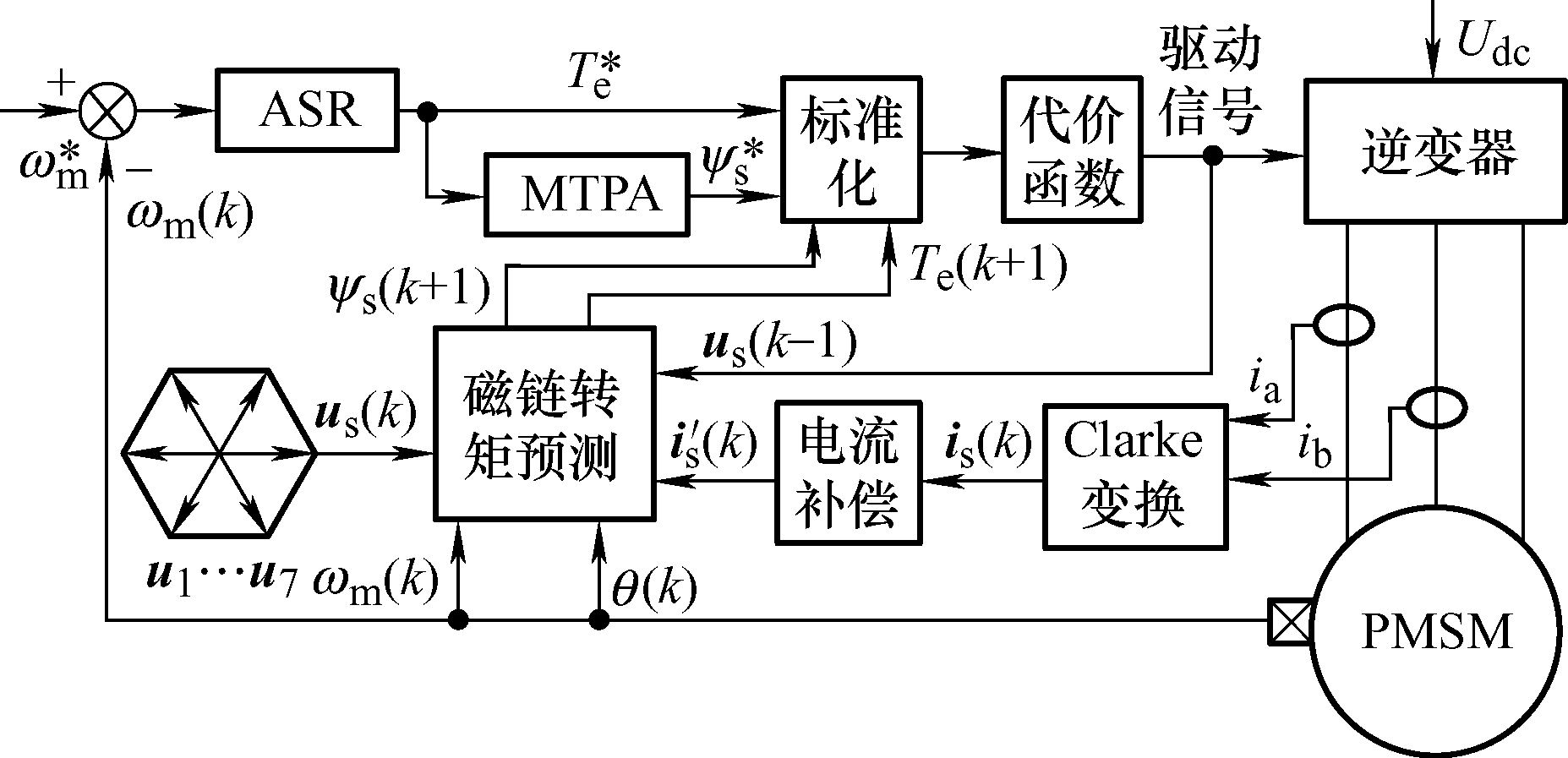 图5 考虑权重因子校正和延时补偿的MPC-DTC原理框图 |