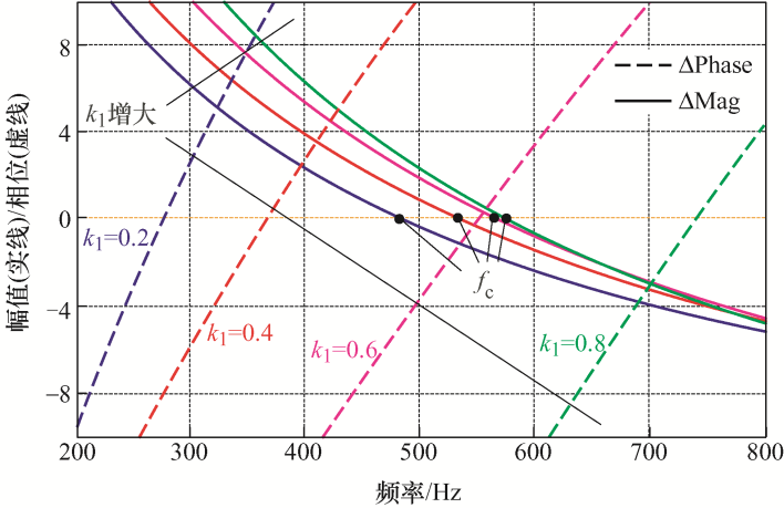 图5 低频前馈通路增益k1变化时对∆Mag、∆Phase的影响 |