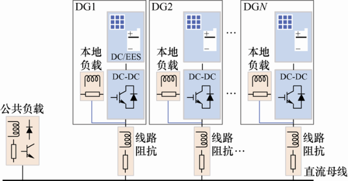 在直流微电网中,分布式电源通过DC-DC变换器与直流母线相连。下垂控制来源于对传统同步发电机的下垂外特性的模拟,其主要通过改变电力电子变换器的输出特性来实现功率的合理分配,直流微电网的等效模型如图2 所示。