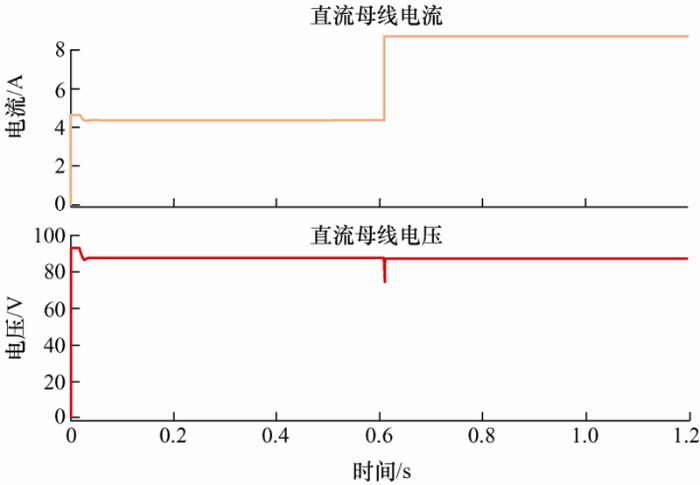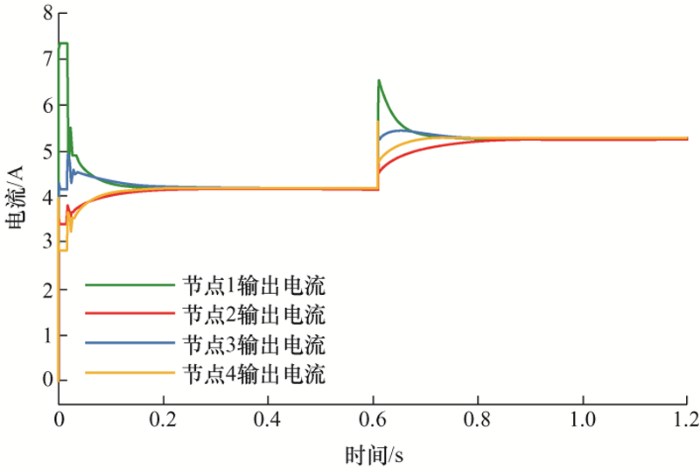 仿真模型在0.61 s时加入公共负载突变。图8 所示为各节点电压波形,图9 所示为各节点电流波形,可见在公共负载突变前,4个节点的电压和电流均可一致性收敛。当发生公共负载的突变后,4个节点可以仅在0.3 ms内便可继续保证电压和电流的一致性收敛,具有很快的暂态恢复速度。图10 为直流母线电压与电流波形,说明了所提方法可以实现良好的电压调节能力和精确的功率分配。