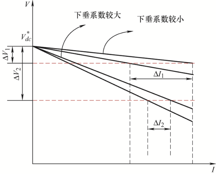 由式(2)可知,下垂控制的$I-V$ 曲线(图3 ),下垂曲线方程为线性方程,其斜率${{R}_{i}}+{{R}_{li}}$ 也被称为下垂系数,截距等于$v_{dc}^{*}$ 。