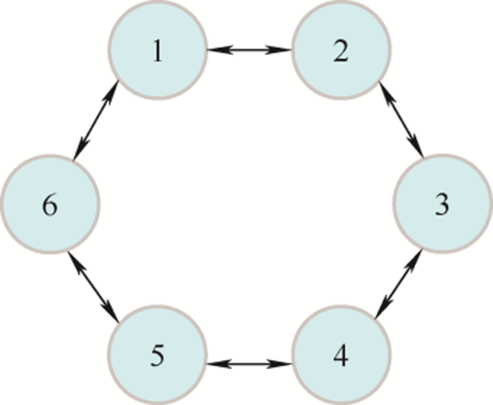 为了建立各个分布式节点之间的通信关系,需要引入图论的知识[9 ] 。首先介绍图的概念,图是由各个节点组成的一个集合,如图6 所示是由6个节点构成的图,顶点的集合可以表示为$V=\{1,2,3,4,5,6\}$ ,通常用边来反映节点之间的通信连接,记为$E=(12,23,34,45,56,61)$ ,因此图可以表示为$G=(V,E)$ 。