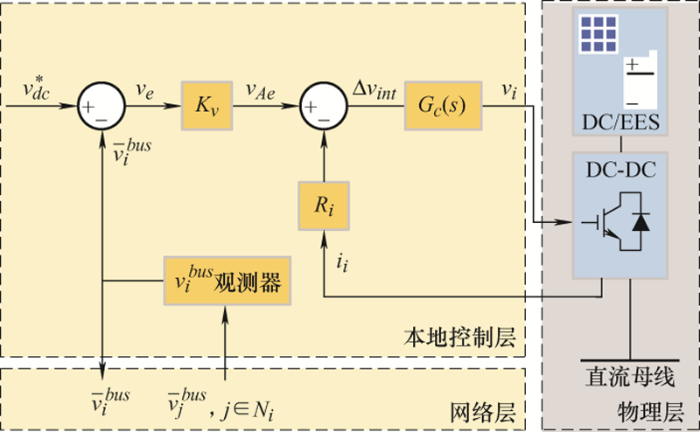 式中,${{H}_{i}}(s)$ 和${{G}_{i}}(s)$ 分别为用于电压调节和功率分配的PI环节;${{a}_{ij}}$ 为对应系数;$c$ 为耦合系数;${{N}_{i}}$ 为包含节点i 的所有相邻单元的集合;$v_{dc}^{*}$ 为设定的额定电压值;${{v}_{i}}$ 为节点i 的输出电压;$\overline{v}_{i}^{bus}$ 和$\overline{v}_{j}^{bus}$ 分别为节点i 、j 对应的母线电压观测值;${{i}_{i}}$ 和${{i}_{j}}$ 分别为节点i 、j 对应的输出电流。