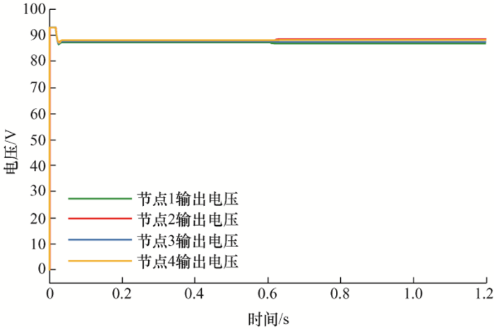 仿真采用的仿真时长为1.2 s,仿真步长为200 ms,一致性算法迭代周期为0.002 s,仿真模型采用4个分布式电源节点并联至直流母线上,其功率分配比为1∶1∶1∶1。