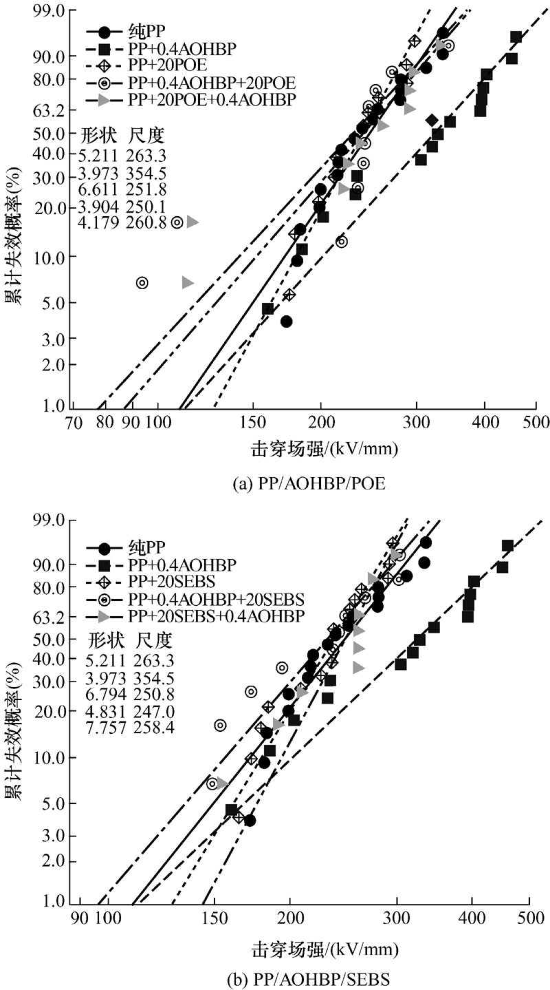 | 图7 PP/AOHBP/弹性体共混物常温下的直流击穿场强Weibull分布 |