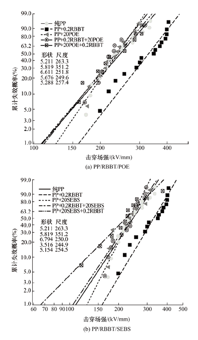 | 图8 PP/RBBT/弹性体共混物常温下的直流击穿场强Weibull分布 |
