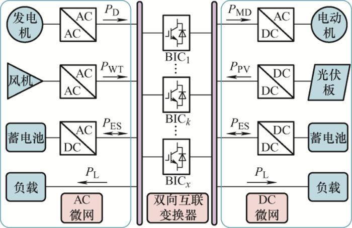 ... 交直流混合微电网能够以更高的效率和更好的兼容性,有效地解决各种交直流负载、分布式电源和分布式存储的集成问题[1 -2 ] .从结构上看交直流母线将系统分为三个部分,分别是交流子微网,直流子微网和双向互联变流器(Bidirectional interlinking converter,BIC).在全球范围内,已有多个交直流混合微电网项目得到了验证,其中包括荷兰Bronsbergen假日公园[3 ] 、欧洲超级电网[4 ] 等.在交直流混合微电网中,BIC作为连接交流和直流母线的纽带,主要实现交、直流侧微电网间功率双向流动[5 ] .随着分布式电源数量以及负荷的不断增加,要求BIC将具有更高的功率处理能力.由于单个BIC功率受限,常采用多并联BIC结构以满足微电网不断扩容的需求[6 ] . ...