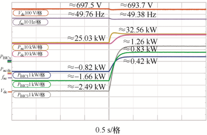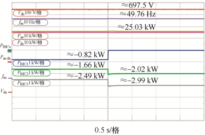 图10 验证了该控制策略可实现系统中功率双向流动。在图8 a稳定运行的基础上在交流侧增加15 kW的负载功率,交流侧频率下降至49.38 Hz,直流侧电压下降至693.7 V,交直流侧功率波动后均稳定在32.56 kW,BIC功率分别上升,由反向流动变为正向流动的0.42 kW、0.83 kW和1.26 kW,可发现该控制策略能实现功率双向流动,其输出功率比值仍保持为1∶2∶3,再次验证了功率可按比例分配。