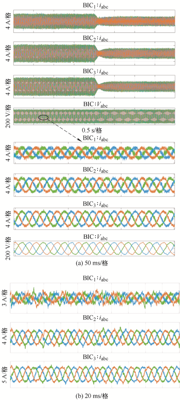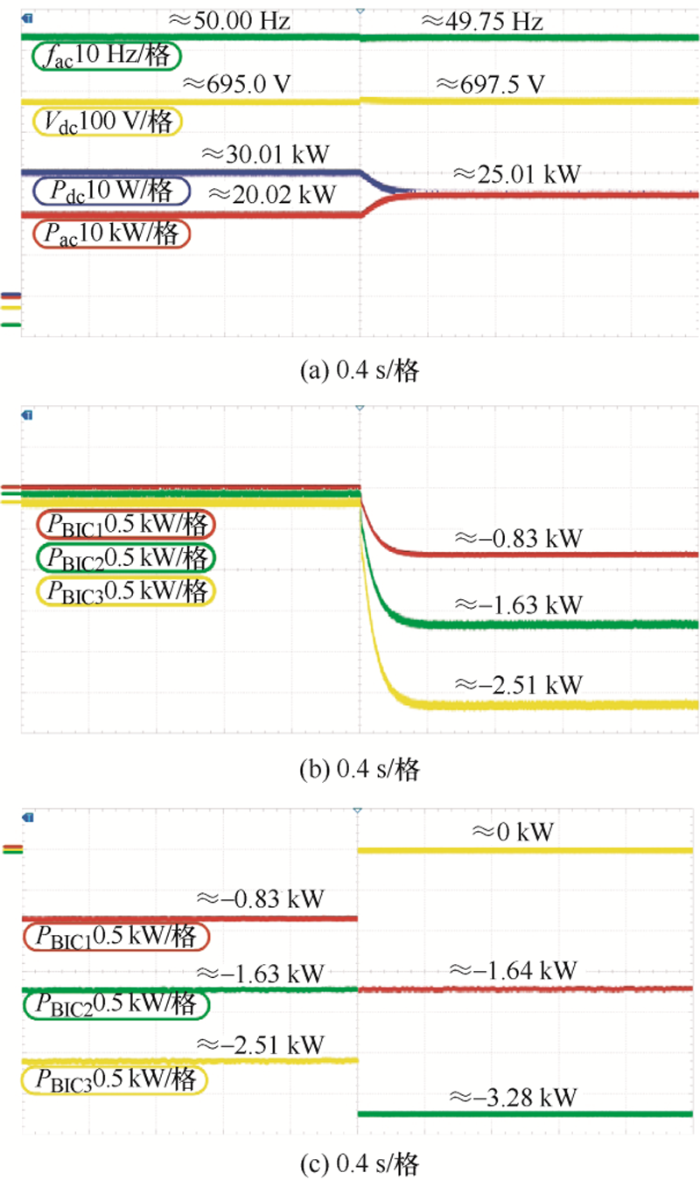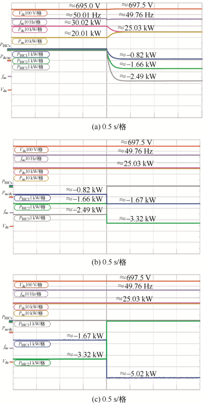 图8 给出了三台BIC同时启动,然后依次将非主导BIC脱离系统的波形图。图8 a所示,首先运行交、直流子微网,BIC不运行,交流负荷功率为20.01 kW,频率约为50.01 Hz;直流负荷功率为30.02 kW,电压约为695.0 V。显然,此时交流负荷小于直流负荷,当启动BIC后,交流子微网将向直流子微网提供部分功率,最终两侧发电功率均稳定为25.03 kW。交流侧频率和直流侧电压分别稳定为49.76 Hz和697.5 V。三台BIC传输功率分别约为-0.82 kW,-1.66 kW,-2.49 kW,能够准确地按额定功率比例1∶2∶3分配传输功率。如图8 b、8c所示,当依次切断BIC3 和BIC2 ,其余BIC按额定功率比例承担剩余所需传输功率,以保持交直流侧负荷稳定。综上所述,文中所提出的控制策略可实现交直流侧功率根据不同功率等级的BIC比例进行功率分配,且具有即插即用的功能。