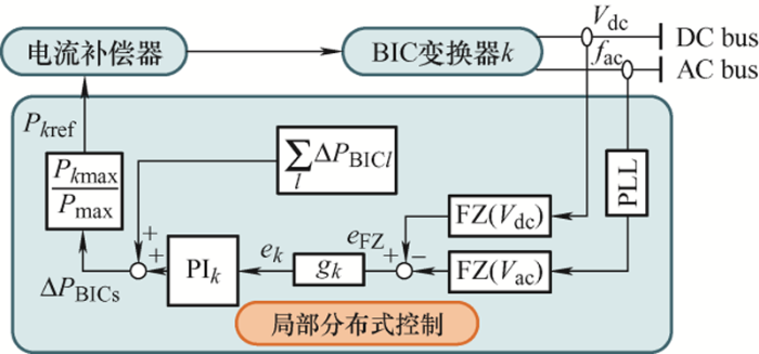式中,gk 为控制增益;ek 为误差信号;ΔP BICs 为整个BIC所需给定的功率;Pk ref 为BICk 的功率给定值;由于PI控制器的作用,当系统稳态运行时,$\left| \text{FZ}({{V}_{\text{dc}}})-\text{FZ}({{f}_{\text{ac}}}) \right|$ 值近似为零,每个BIC的给定功率按各自比例分配。
