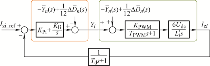 (19) ${{Y}_{n}}=({{K}_{\text{p}n}}+\frac{{{K}_{\text{I}n}}}{s})({{i}_{\text{zn }\!\!\_\!\!\text{ ref}}}-{{i}_{\text{z}n}})-(-{{\overline{Y}}_{n}}(s)+\frac{1}{12}\Delta {{\overline{D}}_{n}}(s))$