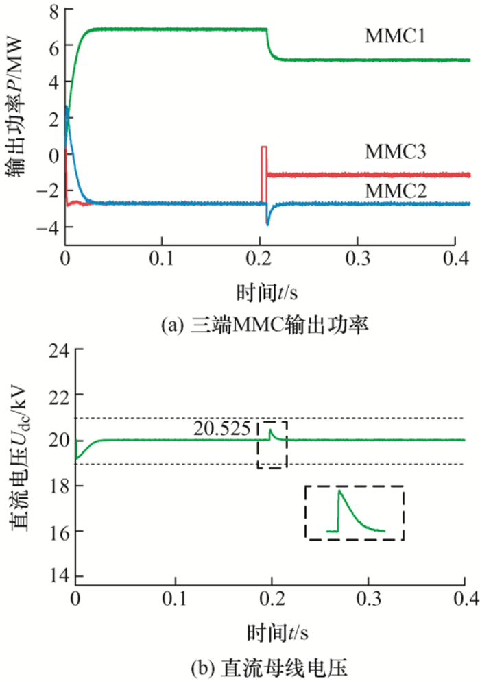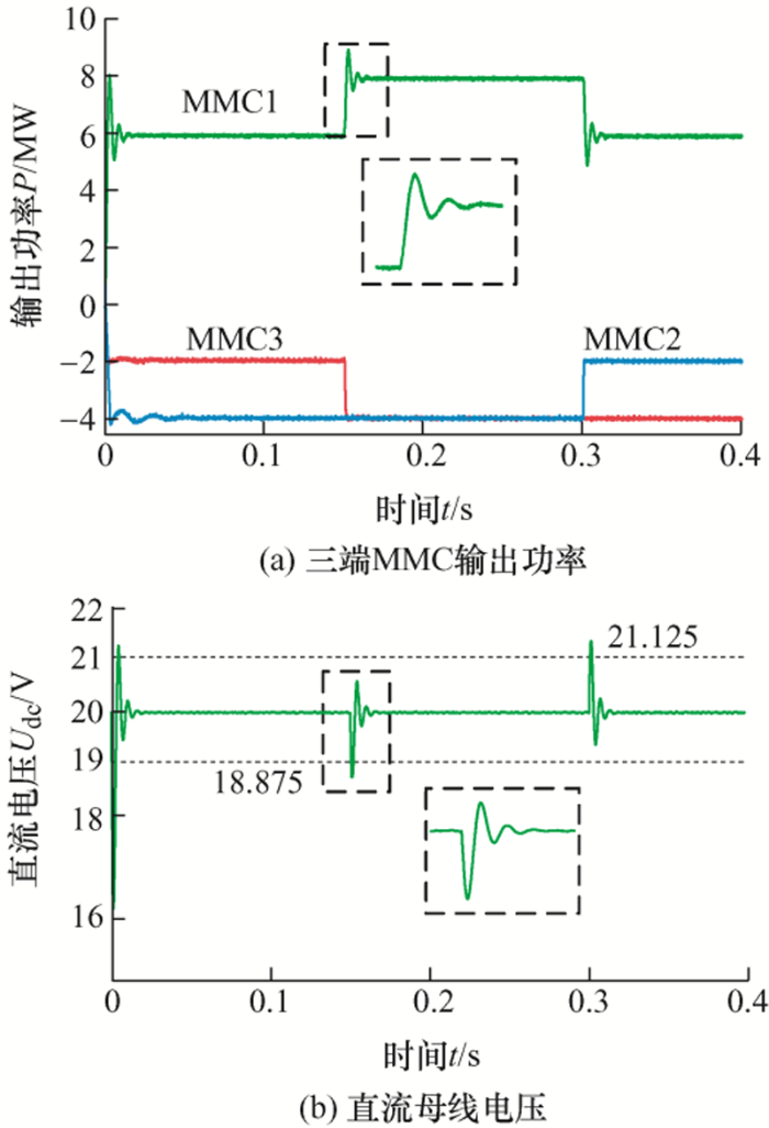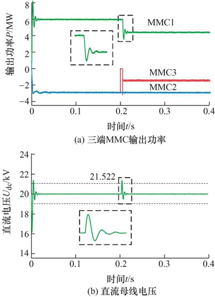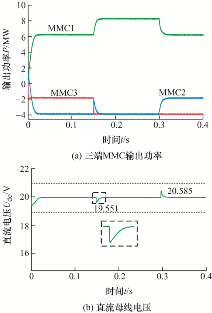 初始时刻,MMC2和MMC3的有功功率参考值分别设置为-4 MW和-2 MW,MMC1输出的有功功率为6 MW。系统传输功率平衡,直流电压稳定。MMC3的有功功率指令值在0.15 s时变为-4 MW,MMC2的有功功率指令值在0.3 s时变为-2 MW。直流电压的上限和下限分别为21 kV和19 kV。