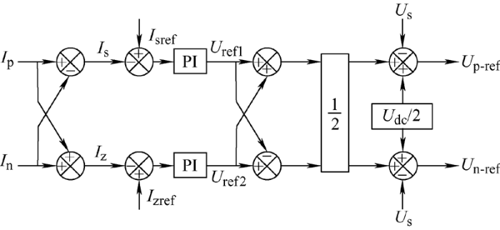 图3 中,U p-ref 和U n-ref 分别为上下桥臂电压的参考值;I sref 为交流电流参考值,I zref 为环流参考值,具体值由外环控制器生成。将环流参考设置为直流量,这样环流环可以抑制环流中的交流分量,减少MMC装置中的无功波动和功率损耗。