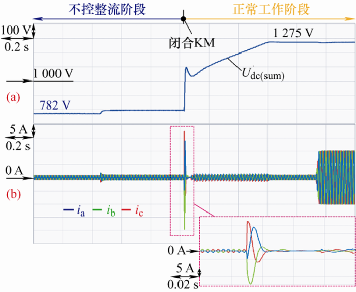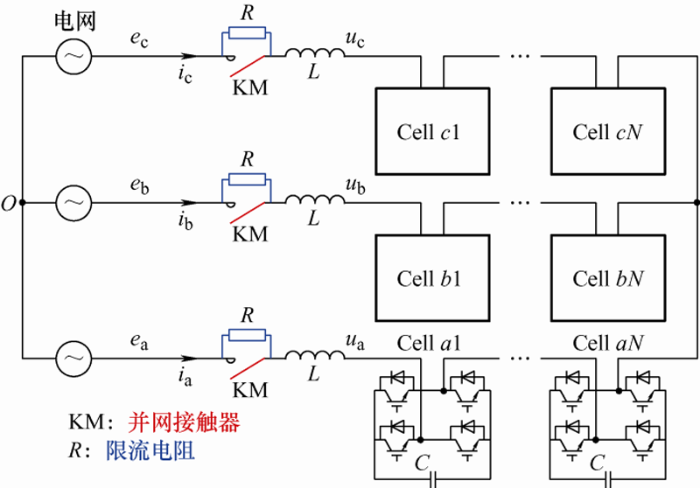 然而,由于STATCOM直流侧电容的初始电压为零,启动时直流侧的电压差会产生较大的浪涌电流,从而威胁装置的稳定运行,甚至损坏开关器 件[12⇓-14]。为了保证STATCOM的正常工作,直流侧电容需要在启动阶段充电至其标称电压值,进而抑制冲击电流。为了实现这一目标,文献[15-16]采用额外的隔离直流电源对直流侧电容充电,然而,由于每个模块的直流侧电容都需要分离的直流电源供电,采用该方法将显著增加系统的复杂性和成本。相较而言,通过电网给直流侧电容充电更适合并网型的CHB STATCOM。但是当并网接触器闭合时,由于直流电压为零,在启动阶段仍会产生浪涌电流。为了抑制浪涌电流,文献[17]通过在CHB STATCOM和电网之间插入额外的晶闸管,实现变步长的软启动控制。然而,在中压应用中,具有高压应力的晶闸管成本高、可靠性低,实际应用较少。一种典型的经济有效的方法是通过串联限流电阻的来抑制浪涌[18],如图1所示,其中限流电阻R与并网接触器KM并联。启动过程中并网接触器断开,电路工作在不控整流状态,电网通过启动电阻和开关管的反并联二极管对直流电容进行充电,直到直流电压稳定。然而,当CHB STATCOM切换为正常工作瞬间,由于直流电压依旧低于正常工作所需的标称电压,即使引入斜坡电流参考或电网电压前馈补偿,仍会产生较大的浪涌电流。