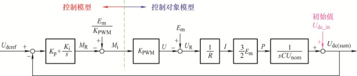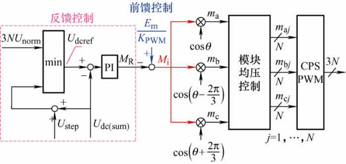从式(6)可以看出,调制比Mi越低,直流电压 越大。因此提出了一种闭环控制方法如图7所示,Udc(sum)为总直流电压,等于所有电容电压之和;Ustep为直流电压的增加步长;KPWM为调制级的增益,当使用载波相移PWM(CPS PWM)时,其值等于直流链路电压NUdc(con);θ为该相电网电压的相位角。