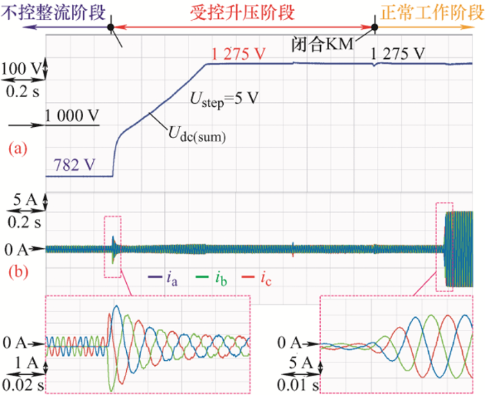 软启动对星形级联H桥(CHB)STATCOM的正常运行至关重要。传统的CHB STATCOM启动策略通过在不控整流过程中串联限流电阻来抑制浪涌电流。然而,由于不控整流后直流侧电容电压仍然较低,CHB STATCOM进入正常运行时会产生较大的浪涌电流。为了消除这种浪涌电流,提出一种新的CHB STATCOM启动控制方法,在不控整流阶段后引入可控升压阶段,继续串联限流电阻,进一步提高直流电容电压。在可控升压阶段中,建立了调制电压与直流电压的关系,在此基础上提出了一种直流电压的闭环控制方法。最后,搭建400 V/5 kVar CHB STATCOM样机,试验结果验证了所提启动控制策略的有效性。