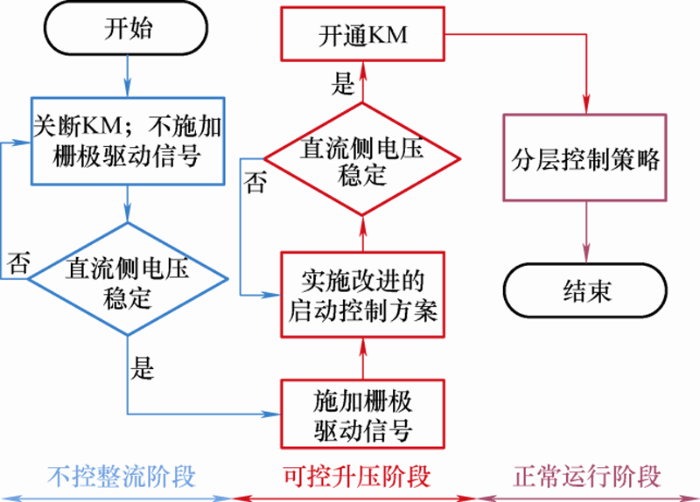 为解决传统启动控制中直流侧电容升压不足的问题,需要在不控整流阶段后对各开关器件的脉冲信号加以控制,实现直流侧进一步升压。因此,提出了一种改进的启动控制方法。