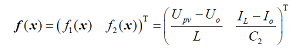 图1 所示的Boost变换器由电感L 、功率开关管VT、二极管VD以及输出电容C 2 组成,变换器的输入端接入前置电容C 1 以提供瞬态的电流需求,同时作为滤波电容吸收影响电感电流的开关纹波。当系统处于稳态且电感电流连续时,光伏阵列的输出电流Ipv 可近似认为与电感电流IL 相等。定义α 为功率开关管的离散控制输入,当系统开关频率足够高并且纹波很小时,可以将离散输入考虑为占空比。因此,定义系统的状态变量为x =(x 1 x 2 )T = (IL Uo )T ,采用非线性滑模控制理论描述Boost变换器的状态空间平均模型可得一般性表达式为