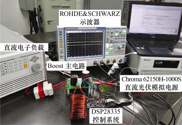 为验证所提方案的可行性,搭建了如图7 所示功率为1.1 kW的试验平台,该平台由Chroma 62150H-1000S直流电源、Boost升压电路、直流电子负载和DSP28335控制系统组成。可编程光伏模拟电源工作于“SAS_MODE”模式。MOSFET选用英飞凌IPW65R019C7,开关频率为20 kHz;二极管选用SiC FFSH2065A;直流电子负载工作于定电阻模式;主电路其他参数与仿真参数相同,如表1 所示。试验内容如下所示:固定光照强度和温度、光照强度变化和温度变化,然后观察光伏电流Ipv 、光伏电压Upv 以及变换器输出电压Uo 的变化过程。