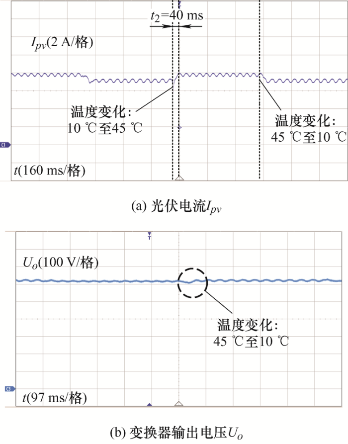首先,稳态条件25 ℃、1 000 W/m2 下的试验结果如图8 所示。图8 a表明系统在最大功率点的光伏电流为7.56 A,光伏电压为146 V左右,电流和电压的波形略有波动。图8 b为变换器的输出电压Uo ,可知系统在稳态情况下误差小。