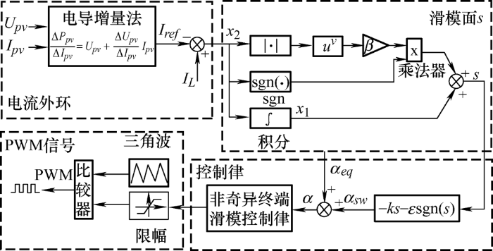 式中,$Q^{-1}=(p q / p)\left|x_{2}\right|^{(q-p) / q} $ 。由于Q -1 的表达形式比较复杂,运算量大,在设计控制器时会增加系统复杂程度[19 ] 。在保证趋近律可以实现最大功率点跟踪的前提下,对控制律式(13)进行适当简化,简化后整体的控制律表达式为式(14)。当x 2 =0时,非线性函数部分不存在零的负指数幂,因此不存在奇异问题,具体MPPT控制框图如图2 所示。