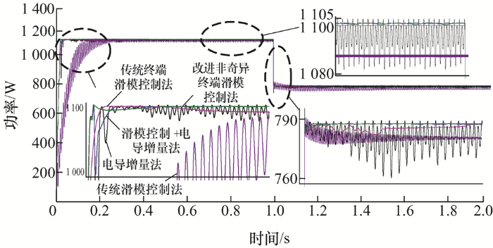 ... 其次讨论光照强度变化下最大功率点跟踪的效果.设置仿真条件如下:温度25 ℃,仿真时间为2 s,在1 s时光照强度从1 000 W/m2 降至700 W/m2 .为了验证所提控制方法的优越性,保持光伏阵列规格、Boost变换器模型、负载以及仿真环境相同,采用不同的控制方法进行对比分析:传统电导增量法[3 ] 、传统滑模控制法[8 ] 、基于电导增量法和滑模控制结合法[11 ] 、传统终端滑模控制法[16 ] 以及本文所提非奇异终端滑模控制法.图5 为光伏阵列输出功率随光照强度变化的曲线对比图.从图5 中可以看出,当温度不变而光照强度降低时,光伏阵列的最大功率点降低并且幅度很大,这也说明光照强度对最大功率点的影响较大.对比五种控制方法的仿真结果可知,传统电导增量法虽然控制简单,但输出功率在稳态时振荡较大.传统滑模控制法的启动特性较慢,需要较长时间才能达到稳态,并且条件改变时暂态切换时间较长.而基于线性滑模切换面的电导增量法则具有优异的响应时间和跟踪特性,但无法避免滑模控制本身性质所造成的抖振和超调.本文所提的控制方法的启动响应速度是最快的,并且在到达最大功率点时能保持稳定,整体无波动、无误跟踪. ...
