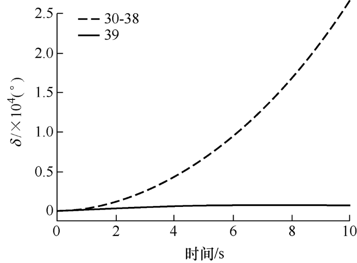 大量仿真表明,系统失稳模式大多为两群摇摆,而多群失稳也往往由两群失稳发展而来[18 ] ,因此本文对两群失稳模式进行研究。设定t= 0时线路Bus14-Bus15的20%处发生三相短路故障,0.23 s后切除故障线路。系统呈现两群摇摆模式,39号机组为滞后机组,其余机组为超前机组,机组功角轨迹如图10 所示。