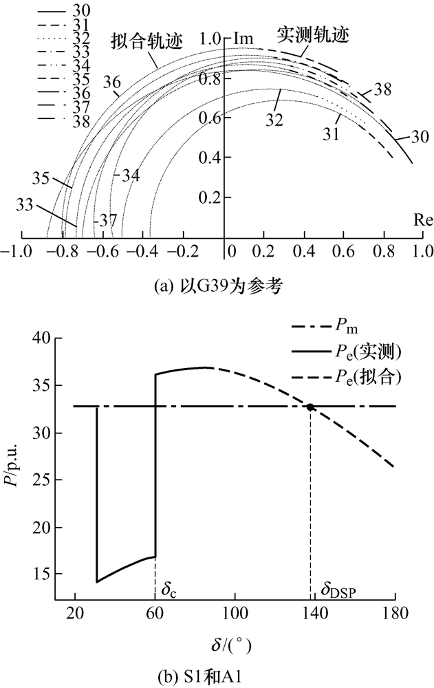 由于η =1.93>1,说明S2 (G31, G32, G37, G38)和A2 (G33-G36)可视为同一群,因此最终预测39号机组和剩余机组分为两群。不断往后滑动拟合窗口,同调预测结果均为超前群S1 和滞后群A1 ,当t =0.32 s时可认为辨识完成。而上述两群的实测等值功-角轨迹在t =0.81 s时越过DSP,继而最终确认S1 和A1 分为两群,该对比说明本文方法因其基于短时量测轨迹而具有预测性质,同调辨识耗时较短。