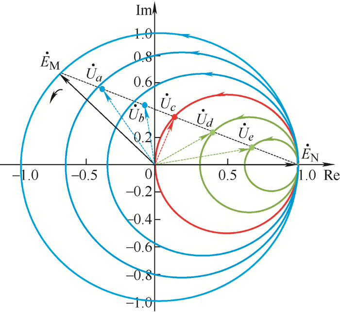 为简单起见,参照文献[14 ],假设系统两电势的幅值相等,此时失步振荡中心恰好落在联络线中点c 处。构造横坐标为电压实部,纵坐标为虚部的电压相量平面,当M侧电源功角δ 在0°~360°内变化,各节点在相量平面内的轨迹为半径不同的圆,如图2 所示。