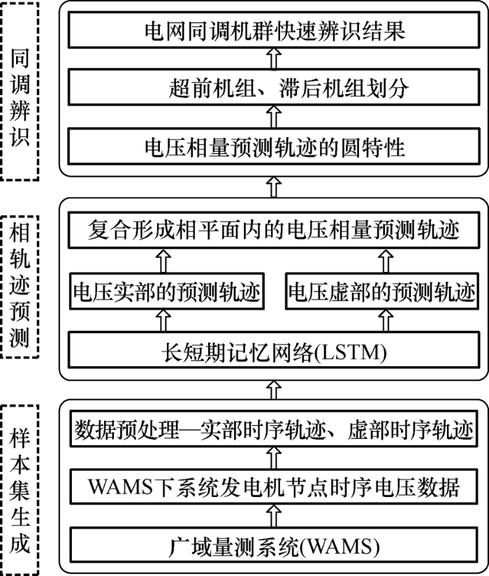 该方法首先基于PMU实时采集电网运行状态数据,并对实时量测的节点电压数据进行统一处理,转换为电压实部、虚部随时间时序变化的动态轨迹;然后,基于LSTM分别对两类时序轨迹进行预测,进而复合形成相量平面内的电压相量轨迹;最后,根据机端电压的相量轨迹判断发电机分群情况,给出同调机群的在线辨识结果。
