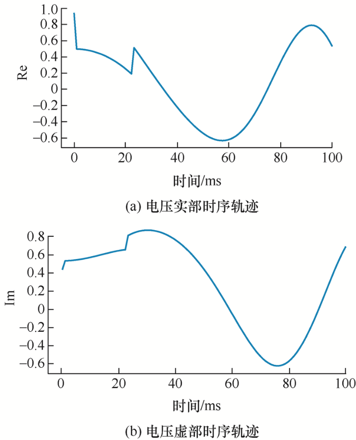 因电压相量轨迹的横纵坐标分别为电压实、虚部,电压相平面隐含了时间属性,给时序轨迹的预测带来难度。本文将电压相量轨迹进行合理拆分,分别得到电压实、虚部随时间时序变化的运动轨迹,如图5 a、5 b所示。待预测完成后,再将电压实、虚部进行复合,即可得到相平面内的时序轨迹。