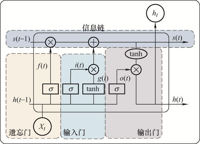 其中,LSTM记忆单元中的信息保存与遗忘通过上述门控装置中的tanh以及sigmoid激活函数实现,具体如下:任意时刻中,门控装置会接收输入信息Xt 以及上一时刻隐含层的输出信息h (t -1)两类信息,除此之外,三个门控装置还会接收来自记忆单元的状态信息即S (t -1)。各门接收上述信息后通过门内激活函数实现信息的遗忘与记忆功能。由图6 可以看出,信息链的更新主要由遗忘门与输入门决定,并最终同输出门共同决定记忆单元的输出h (t ),上述过程中的变量计算如下所示