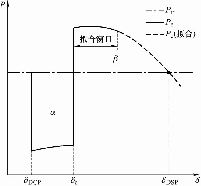 图7 中δ DCP 和δ c 分别为在动态中心点(Dynamic center point,DCP)处和故障清除时刻的等值功角;P m 和P e 分别为等值机械功率和电磁功率。因故障清除后P e 类似正弦曲线,故在拟合窗口内可参考如式(9)的函数形式预测P e 后续一段轨迹(图7 中虚线)。