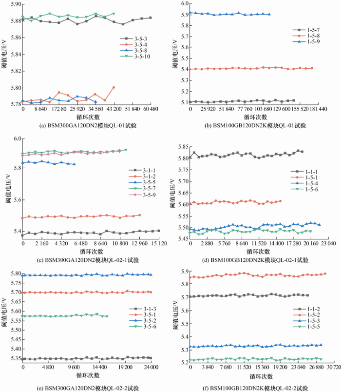 对所选IGBT模块进行老化功率循环试验,考虑到受试样品数量、试验周期及经费,结合IGBT模块的特点、安装形式及位置,综合权衡后决定采用固定导通关断时间的控制时序对两种型号的IGBT模块都进行两种循环周期(分钟级、秒级)的功率循环试验,每隔24 h对样品所选静态参数及热阻进行测量并依次记录,将所得结果和循环次数(时间)拟合之后得到静态参数数值与热阻值随循环次数(时间)退化模型,依托所述模型计算剩余寿命时间。
