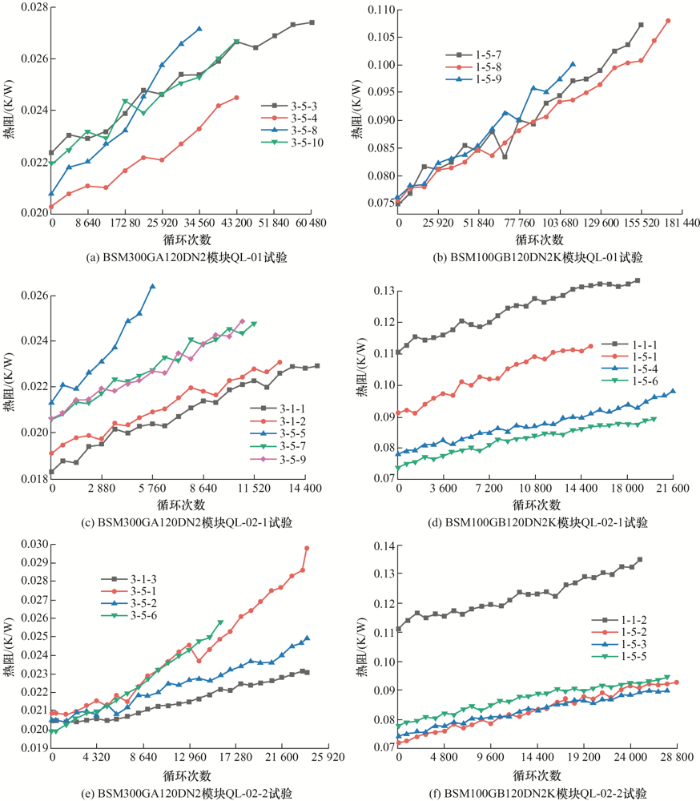 在热阻试验中,首要研究的是热阻随循环次数增加所发生的变化,热阻-时间变化曲线如图13所示。由此可得,在本次试验中热阻与循环次数基本呈现正相关。