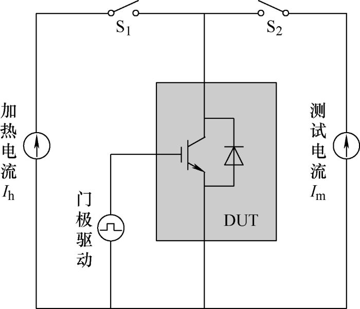 IGBT老化试验原理图如图2所示。测试开始之前,闭合开关S2,先通过测试电流得到待测器件(Device under test,DUT)的失效预兆特征参数初始情况(测试电流一般为10~100 mA的恒流,产生的负载损耗可以忽略);测试开始后关断开关S2,闭合开关S1,使DC加热电流Ih通过待测器件产生功率损耗并且发热;按照事先选择的老化控制策略要求,在合适的时机关断DC负载电流,监测数据,并借助围绕待测器件周围的散热器快速冷却至初始温度,此为一个循环周期,之后继续重复以上步骤,直至待测器件失效。