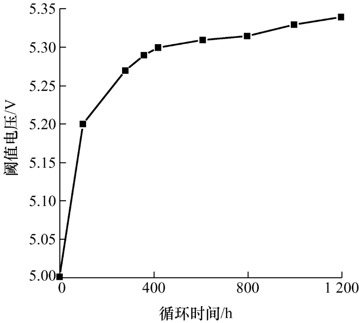 由于上述原因,因此IGBT芯片阈值电压VGE(th)的变化规律如下:在被施加应力前期,阈值电压随疲劳时间的延长而快速增大,随后增大速率逐渐减小直至平稳,如图4所示。