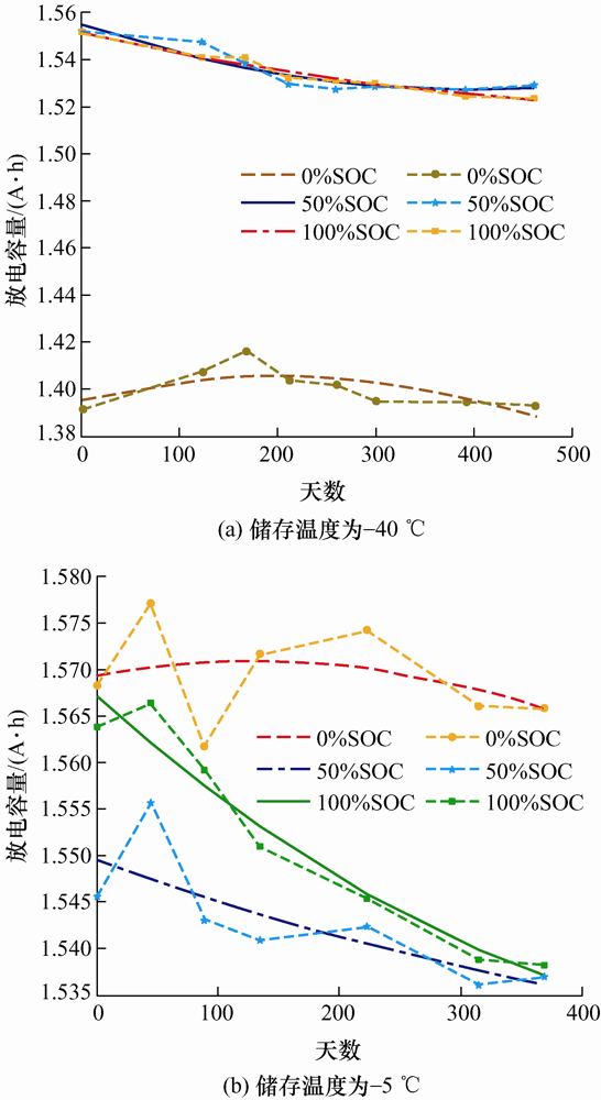 储存温度分别为-40 ℃、-5 ℃,不同SOC值储存的电池容量衰减结果