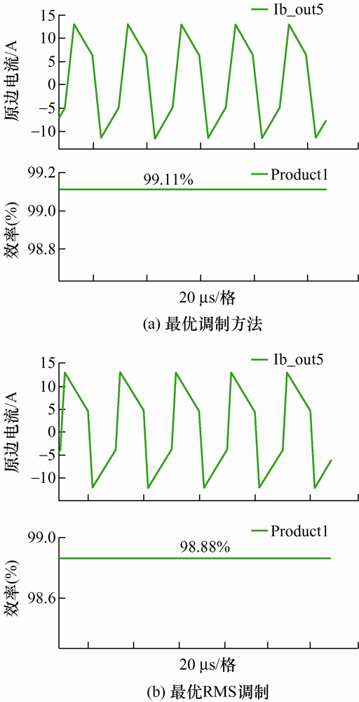 在PLECS中对电压不匹配(d =0.8)的情况进行仿真,选择开关器件C2M0080120D,开关频率50 kHz。对比了P =0.5情况下的最优损耗调制和最优电流有效值的效率,如图10 所示。从图10 可以看出,采用了最优损耗调制的双有源桥变换器效率为99.1%,采用了最优电流有效值调制的双有源桥变换器效率为98.9%,基本与理论计算一致,验证了理论的正确性。