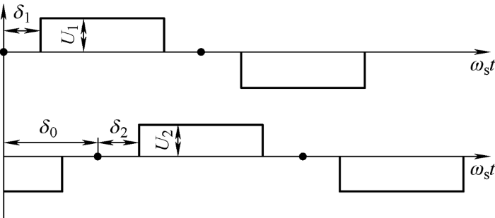 对于一个双有源桥变换器,设开关器件编号为S 1 ~S 8 ,变压器为变比为1∶1的理想变压器,双有源电感为L 1 ,原副边直流电压分别为U 1 和U 2 ,原副边交流电压分别为u 1 和u 2 ,d 为输入输出电压变比。令δ 0 、δ 1 、δ 2 分别代表原副边方波之间的相位差、原边内移相值和副边内移相值,如图2 所示。