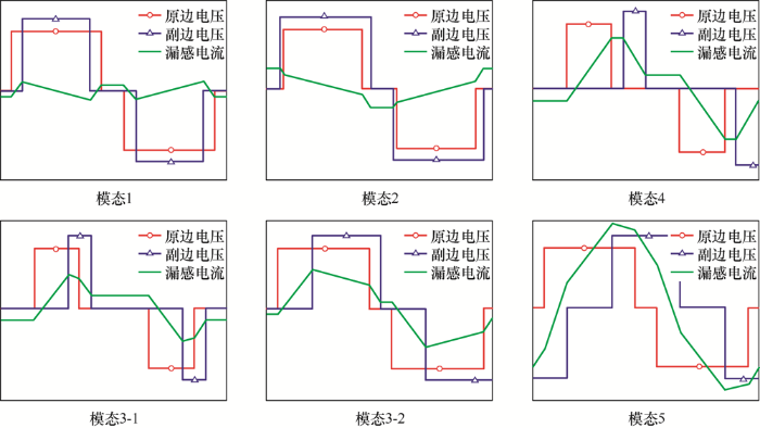 依据不同的调制方式,可以将双有源桥变换器的工作情况分为5种模态,如图3 所示。