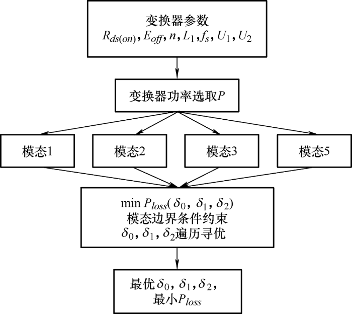 首先确定双有源桥变换器的工作参数,然后依次从小到大选取变换器功率,在不同模态下分别用暴力搜索的方法遍历各工作点损耗,同时利用各模态的边界条件作为限制因素,最终求解得到的最优移相比可以保证双有源桥变换器在给定的工作点、电路参数和开关器件的特性下,取到最小的损耗。