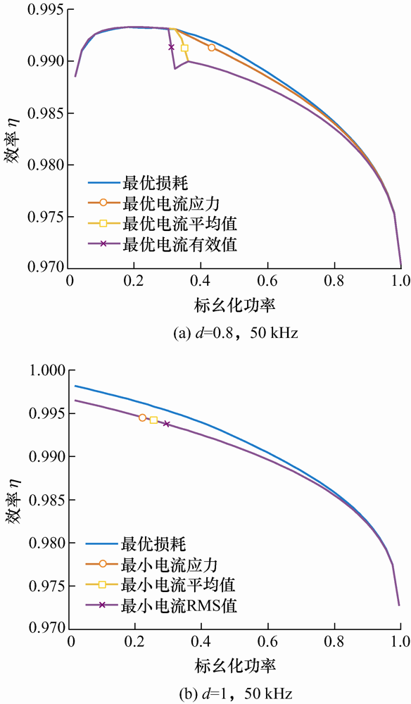 图9 a对比了最优调制策略和现有的几种电流优化调制策略下的效率,此时d =0.8,开关频率为50 kHz。可以看到大约在有功功率小于33%的低功率区,所有的调制方式显示了一样的效率,因为在两端电压不匹配且功率较小的时候,可以通过构造三角形电流波形实现,此时四种调制策略均为效率最优。随着功率增加,上述调制方法无法满足有功功率的需求,在图9 a中约P =0.33处,几种最优调制方式进入不同的工作模式,使用不同的移相比。对比几条效率曲线,本文提出的最优损耗调制,始终能取得最高的效率(即最小的损耗)。随着有功功率逐渐增加到100%,几种调制方法的效率又趋于一致,因为随着负载增加,移相比的调整自由度逐渐减小,几种调制方式的移相比逐渐收敛到唯一可行的移相比。图9 b中,在电压匹配时,即d =1时,最优损耗调制方法在全功率段取得了更高的效率。其他的最优调制方法在电压匹配时均采取最为简单的单移相调制,此时内移相δ 1 和δ 2 均为零,尽管此时可以实现ZVS软开通,关断损耗却并非最小。