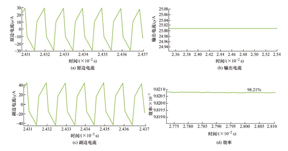 输出电压200 V,变压器原副边电流、输出电流平均值与效率